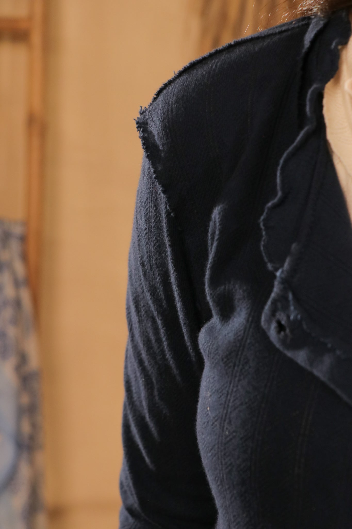 Fermeture boutonnée avec boutons en bois, épaules avec effet couture apparente.