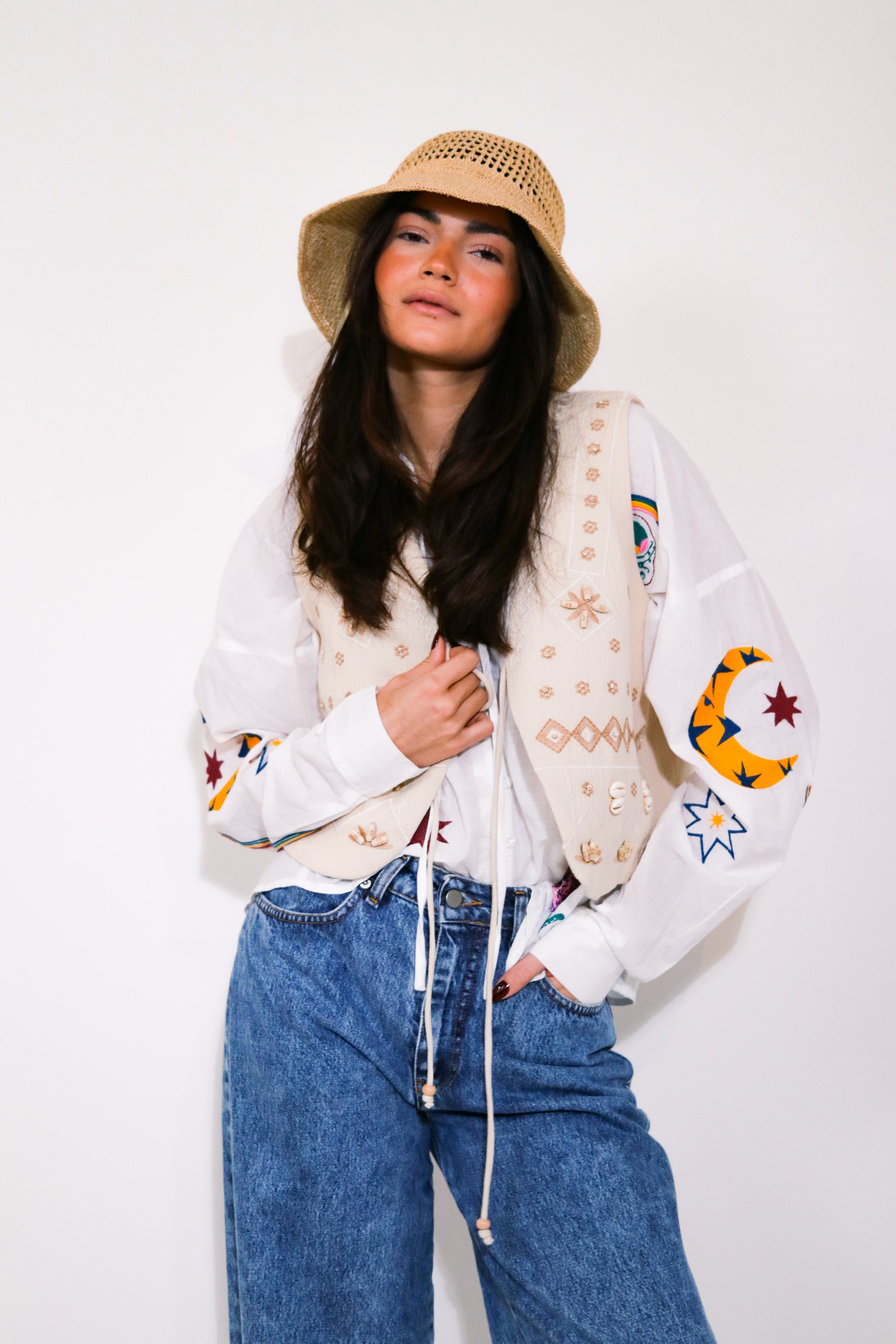 Motifs brodés sur les manches et le devant, inspirés de symboles célestes et graphiques.