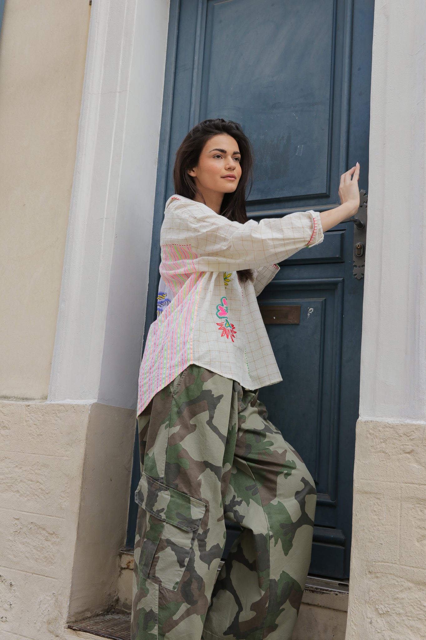 Chemise en coton au travail de patchwork mêlant carreaux et rayures, pour un rendu visuel riche et original.