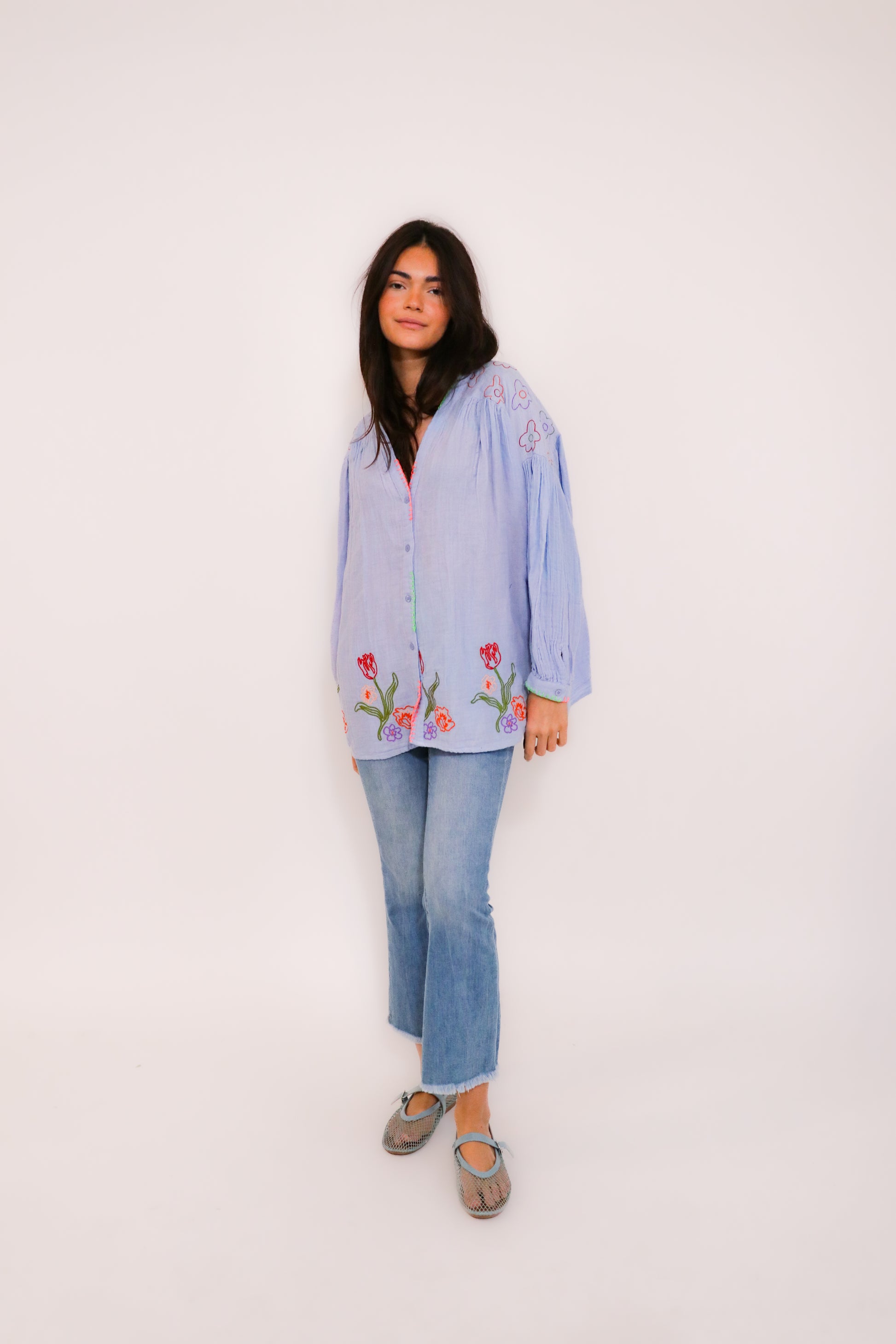 Chemise en coton léger, ornée de broderies florales colorées faites main sur le devant et le bas du vêtement.