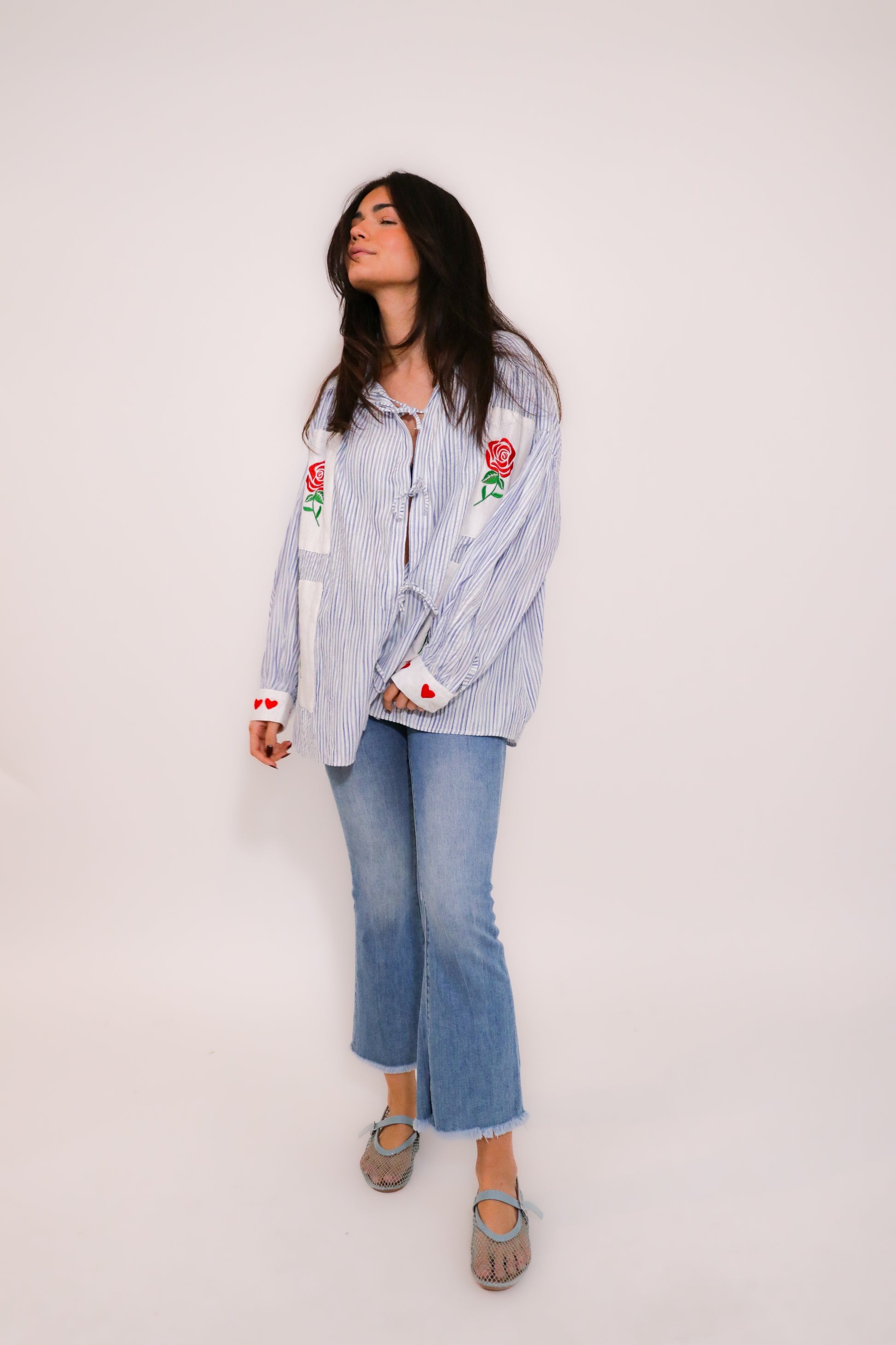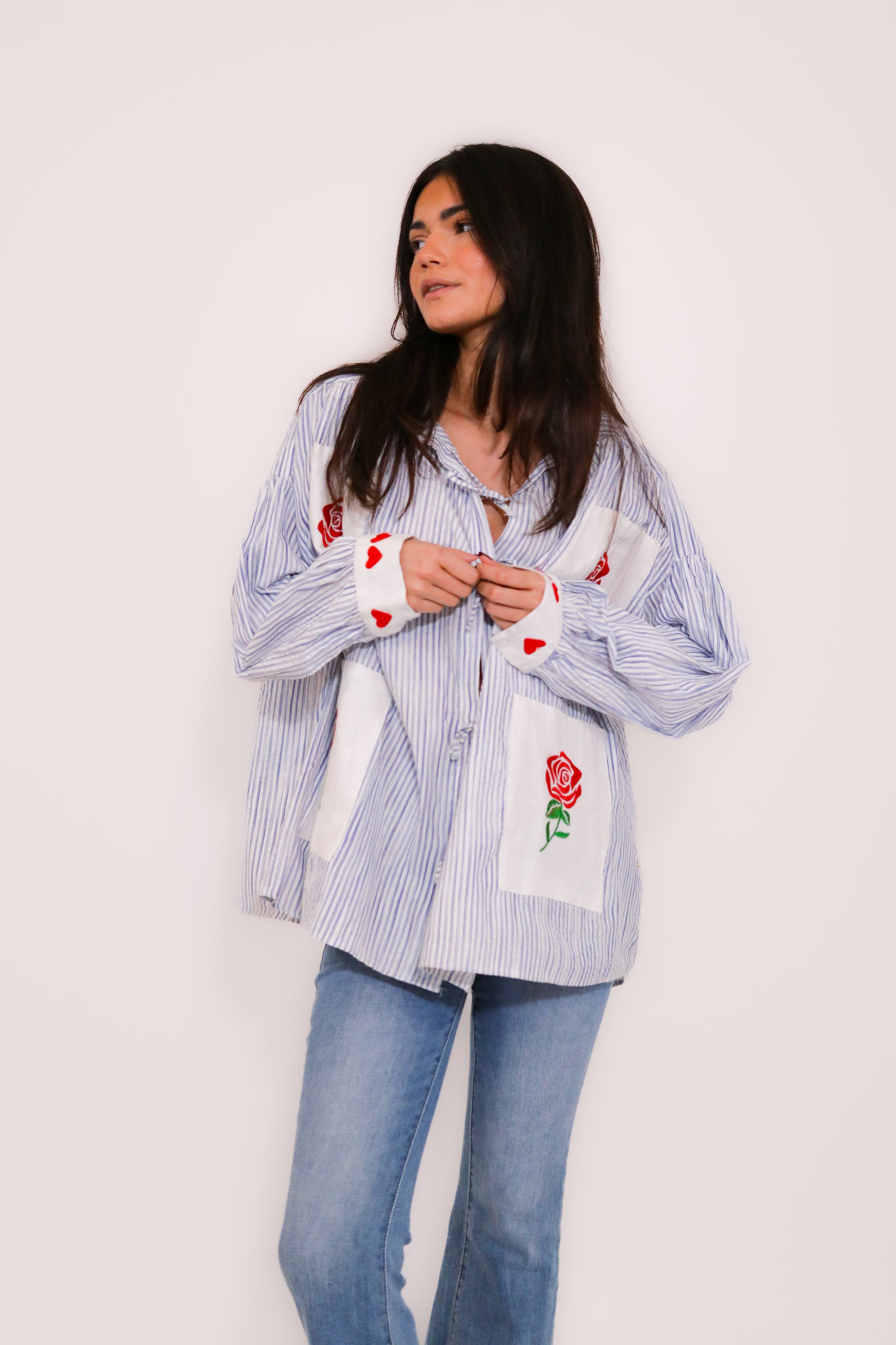 Chemise légère à rayures fines, ornée de broderies artisanales colorées inspirées de motifs floraux et symboliques.