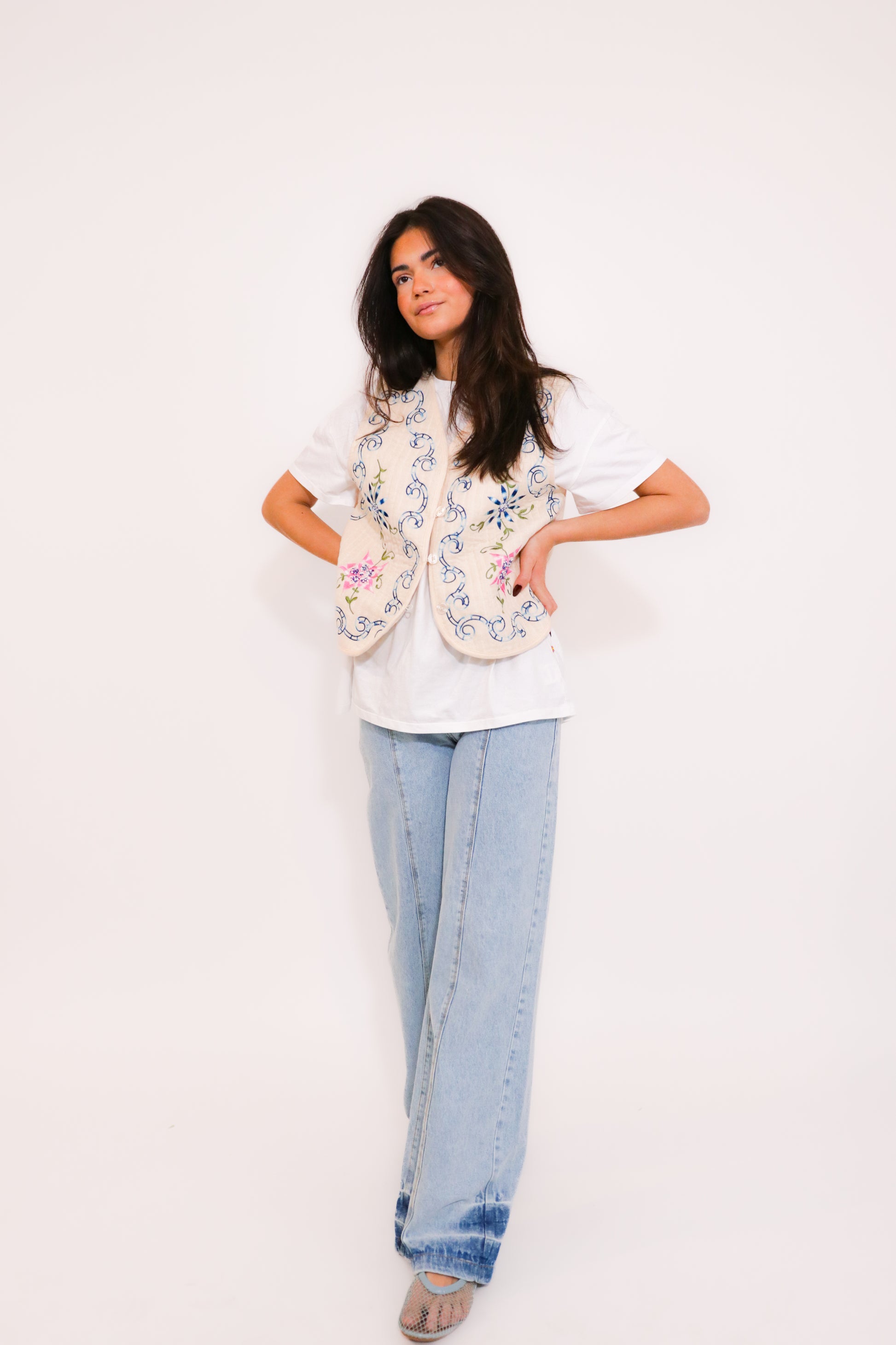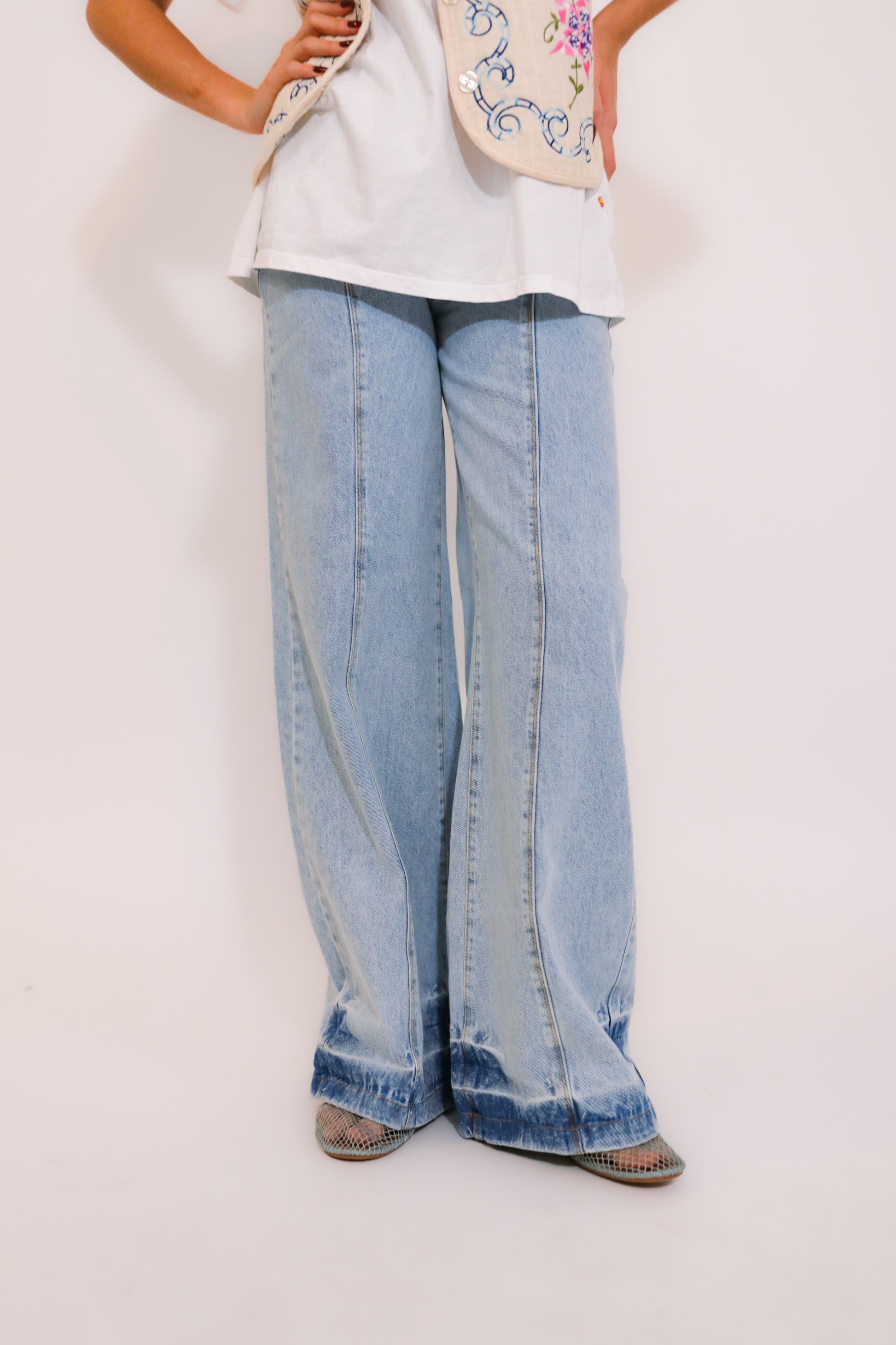Jean taille haute à jambe large, en denim délavé clair.