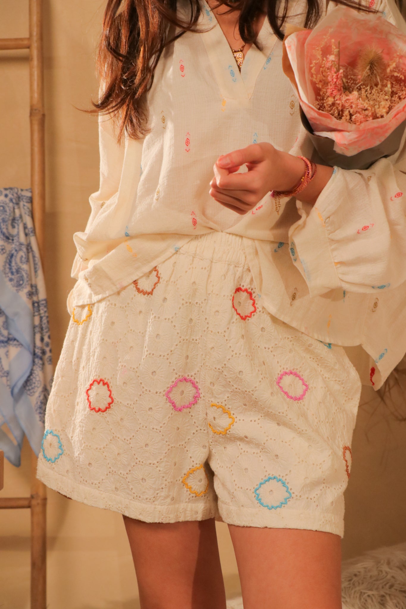 Tissu principal en broderie anglaise avec effet relief sur toute la surface.