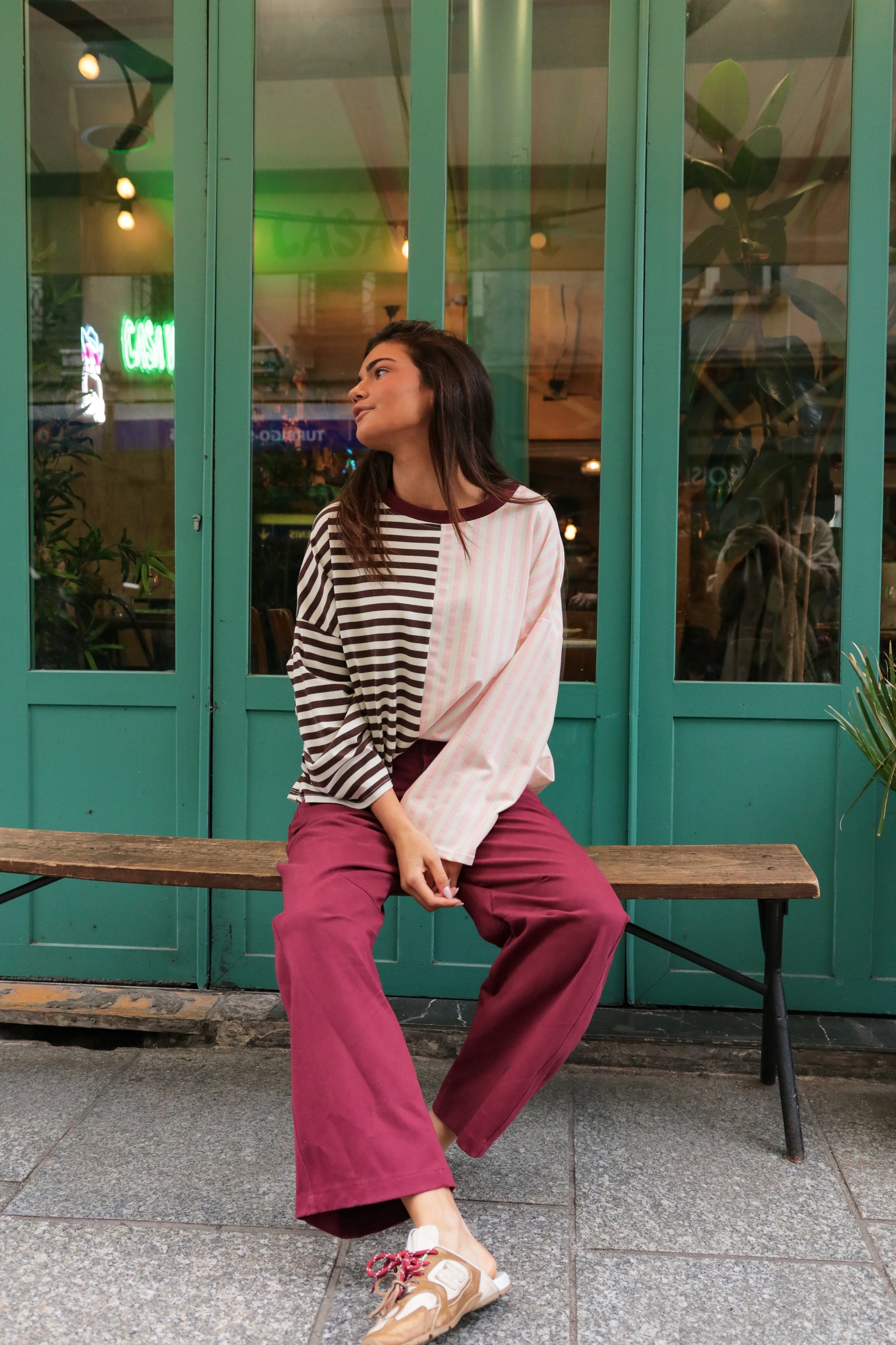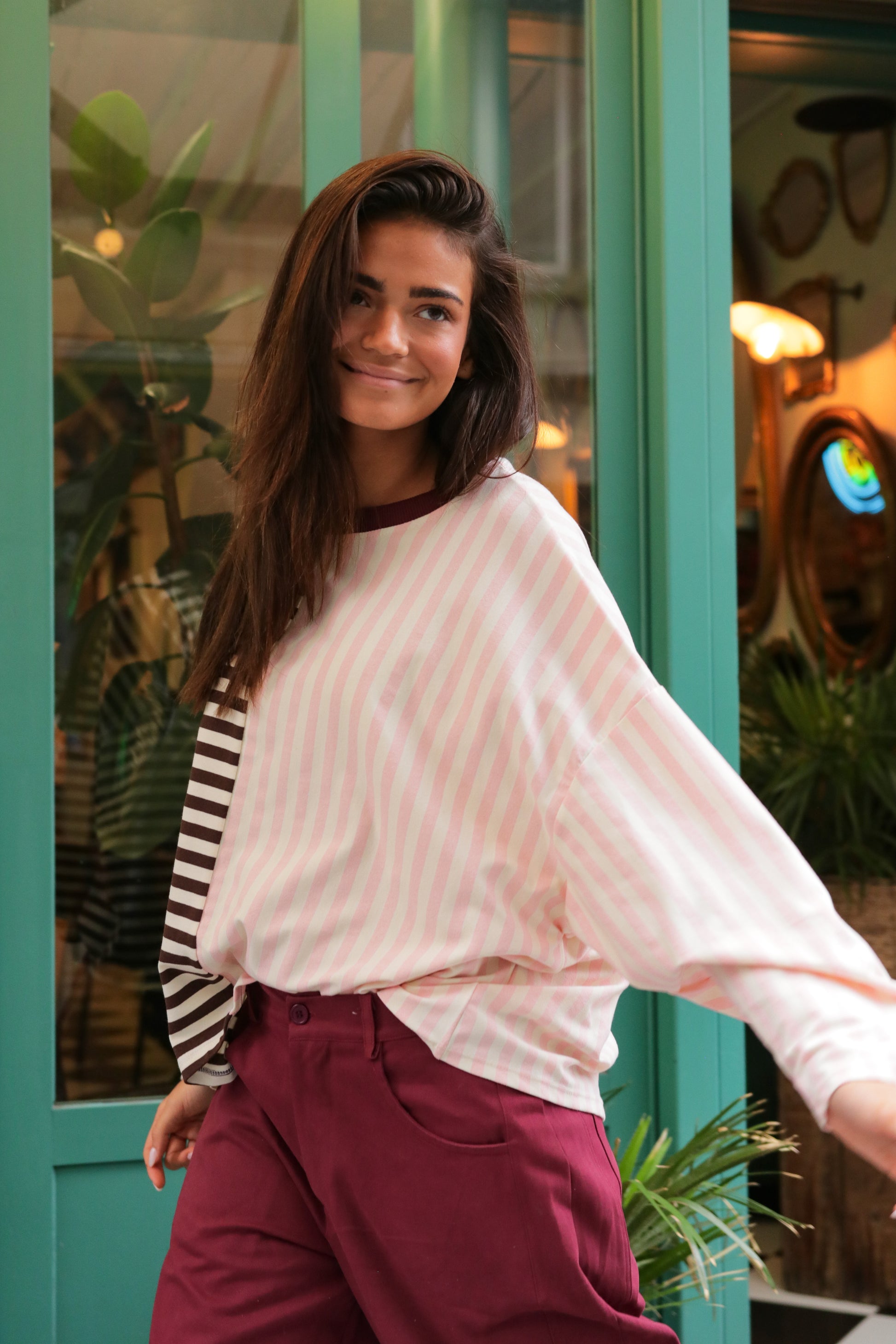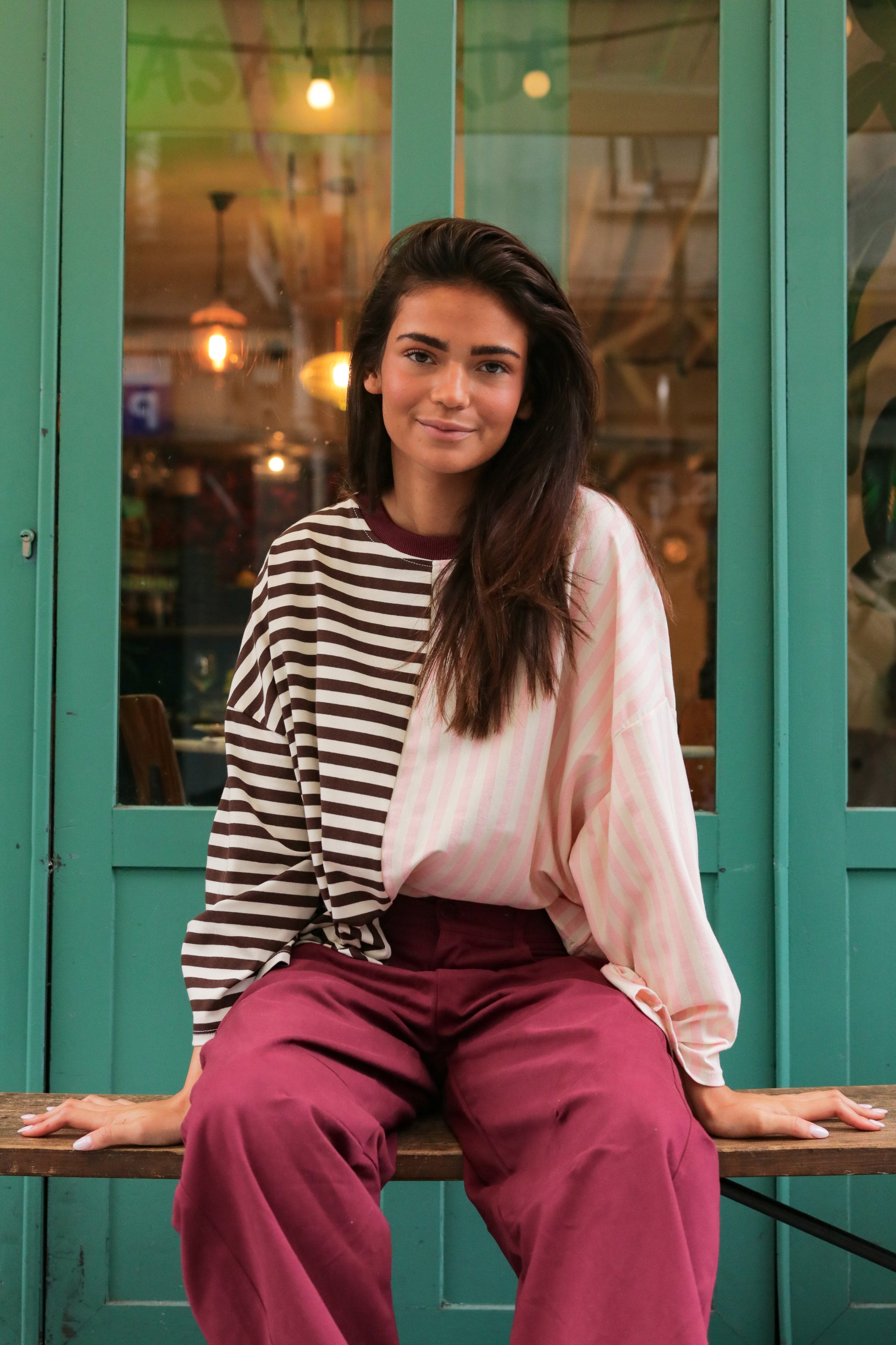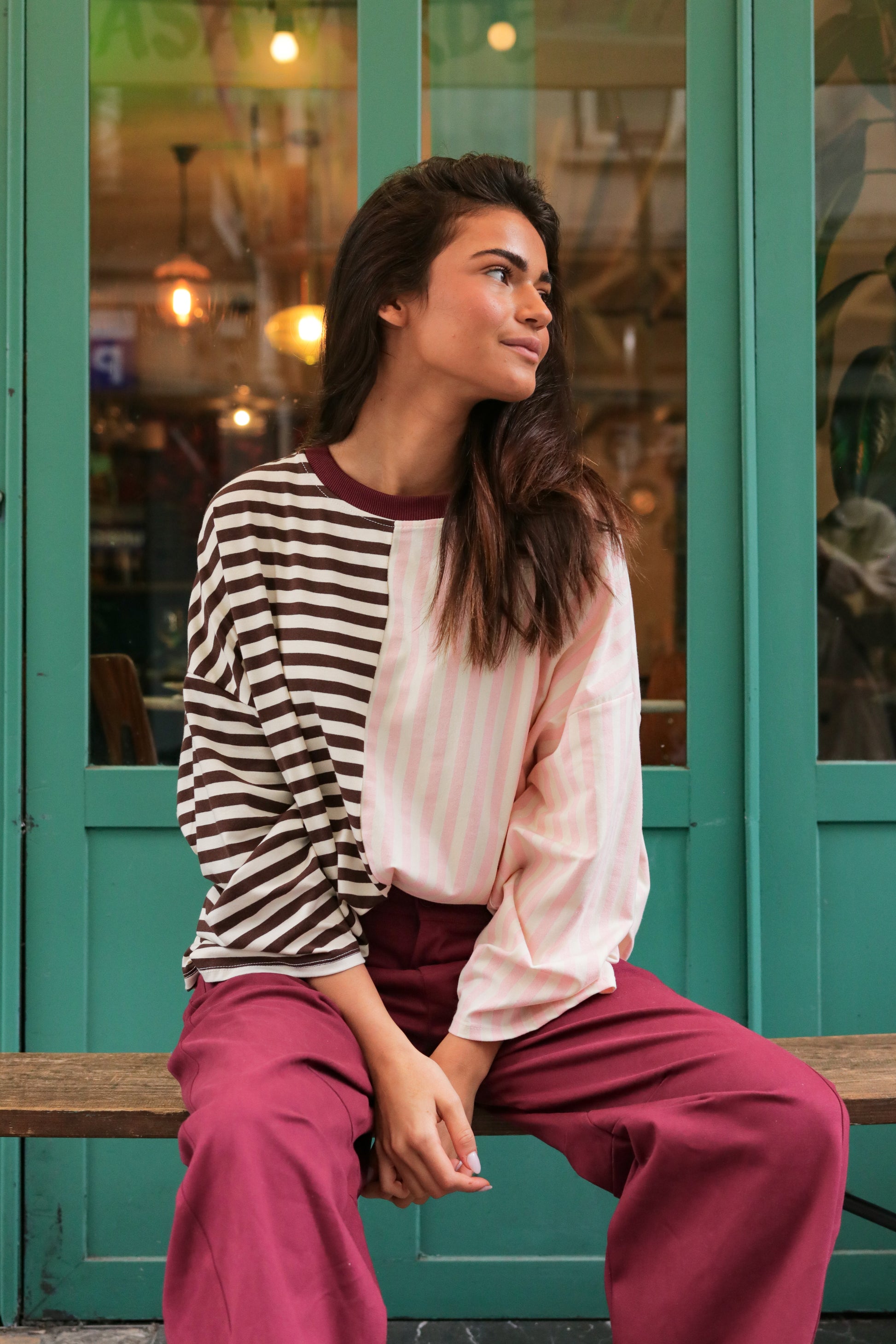 Le côté chocolat apporte de la profondeur, tandis que les rayures rose pastel adoucissent la silhouette et illuminent le visage.