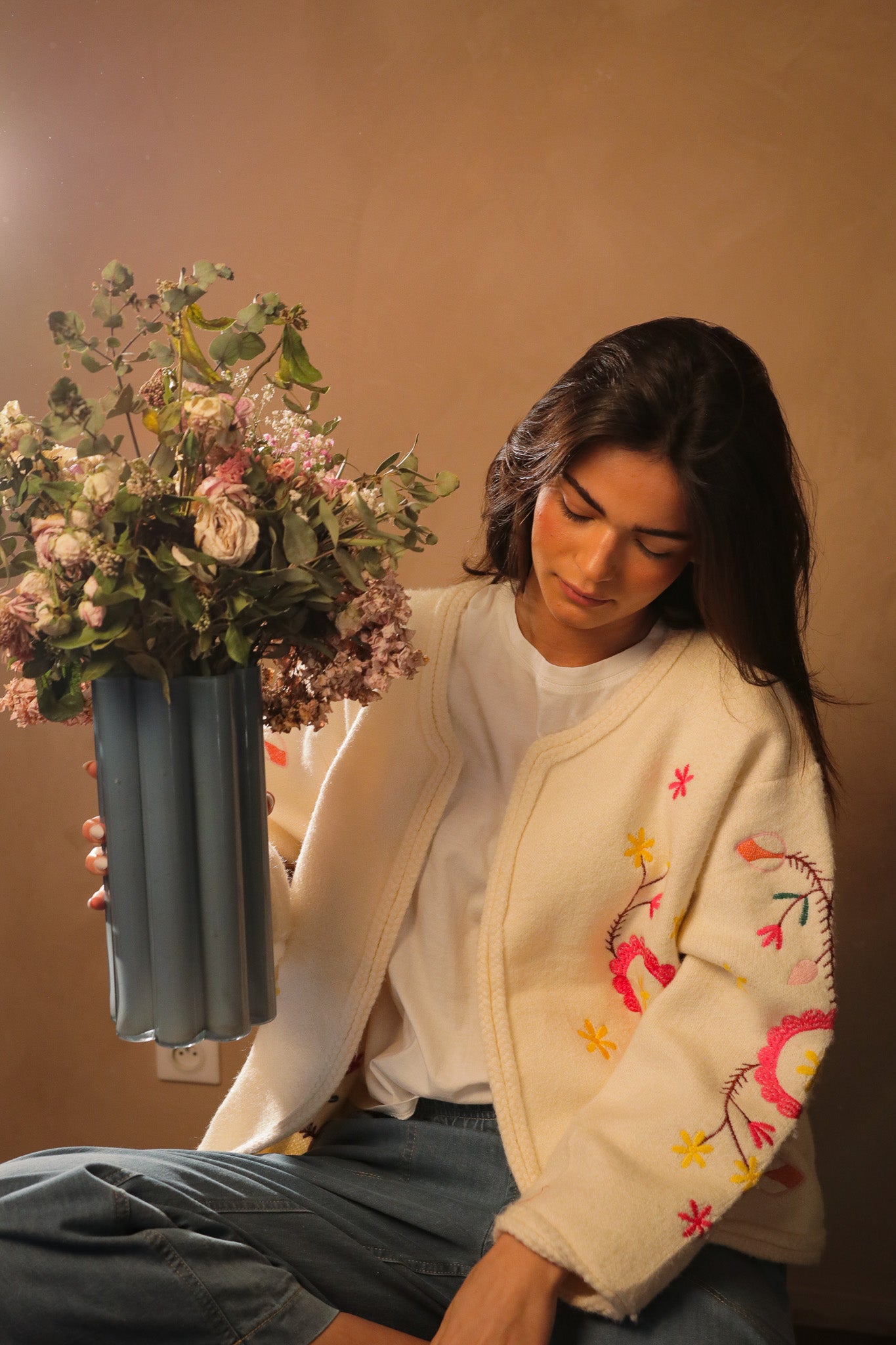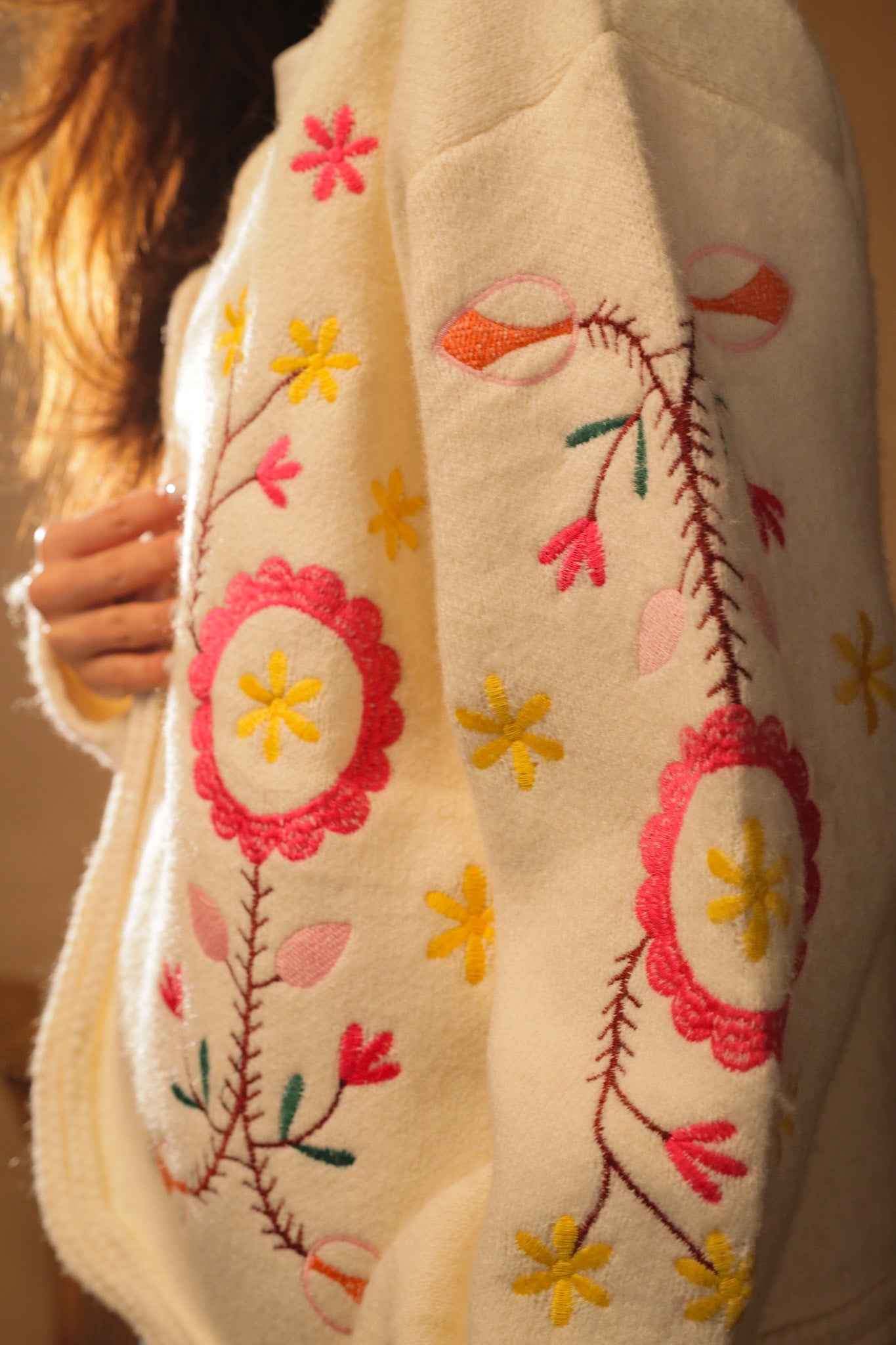 Ornée de broderies florales colorées.