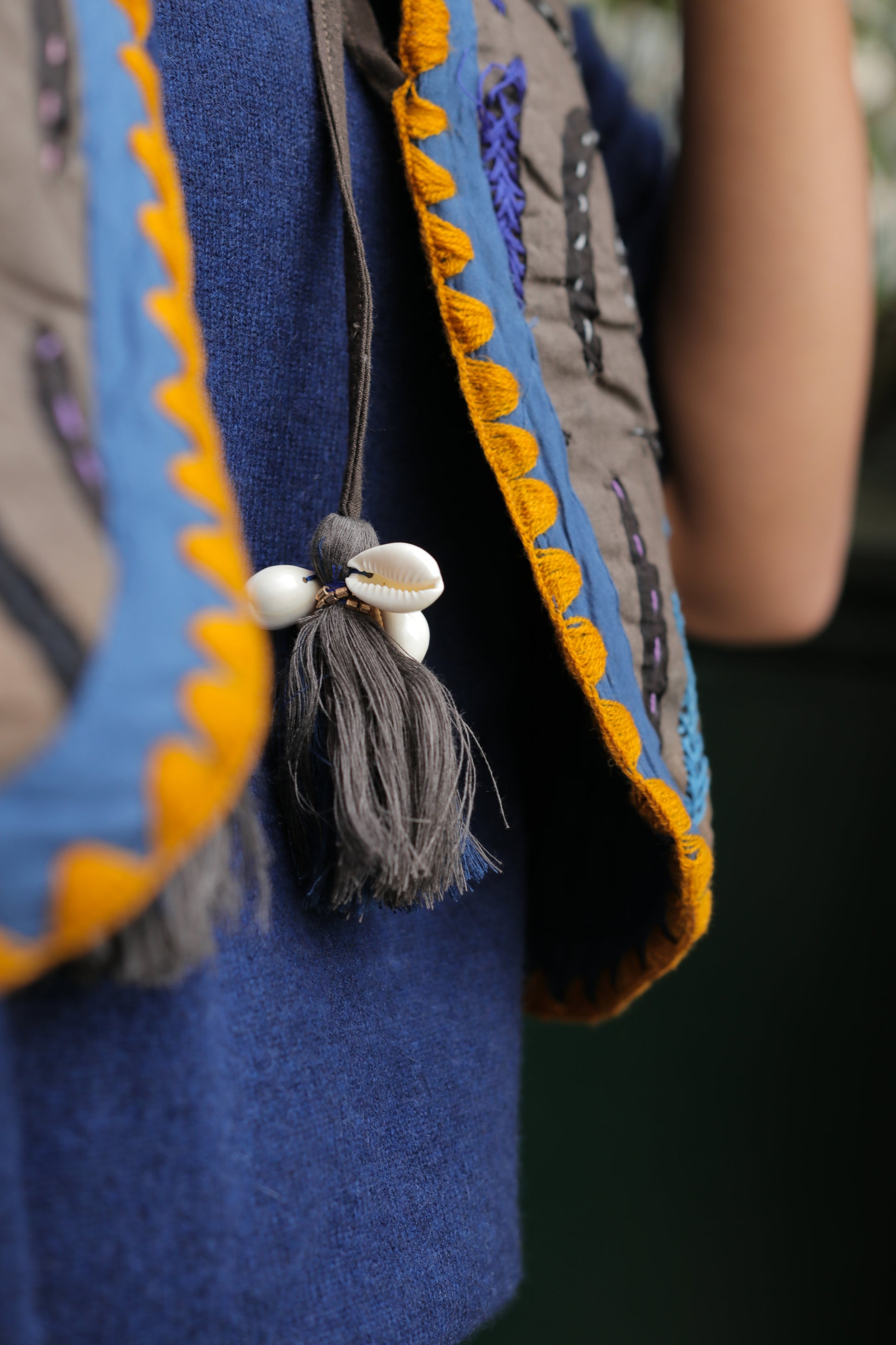 Le passepoil jaune moutarde, associé à des détails en fil bleu foncé, crée un style bohème unique.