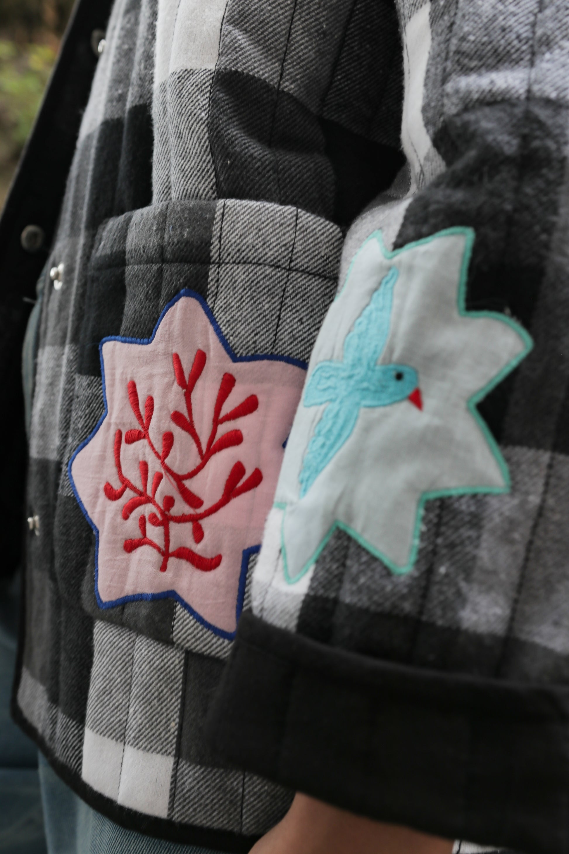 Veste matelassée 100 % coton, ornée d'appliqués brodés colorés inspirés par la nature : fleurs, coraux et feuilles.