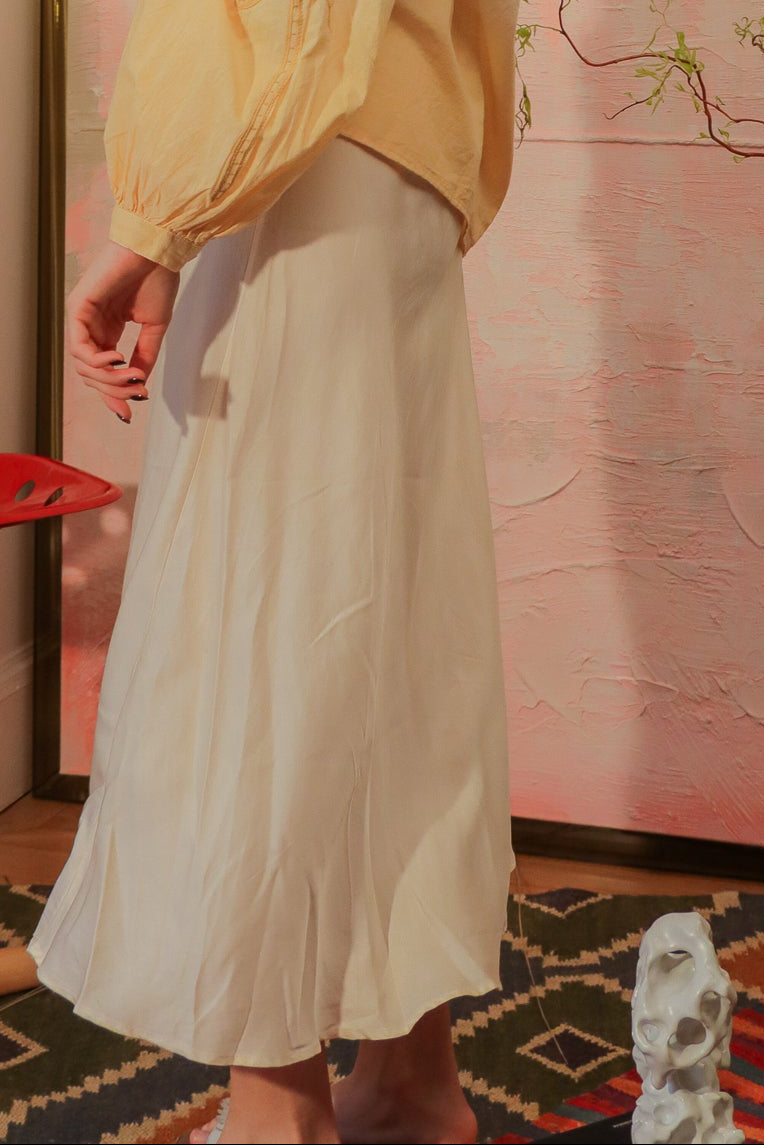 Jupe mi-longue à l’effet soyeux et lumineux.