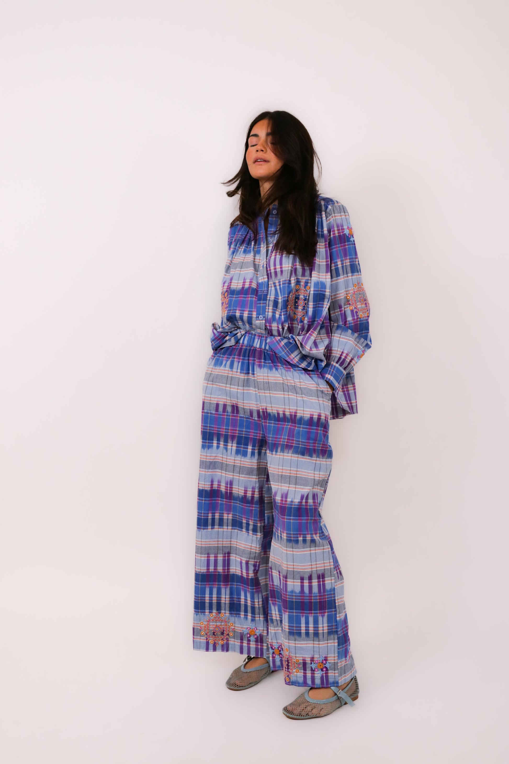 Tissu Ikat mélangé avec des broderies miroir.