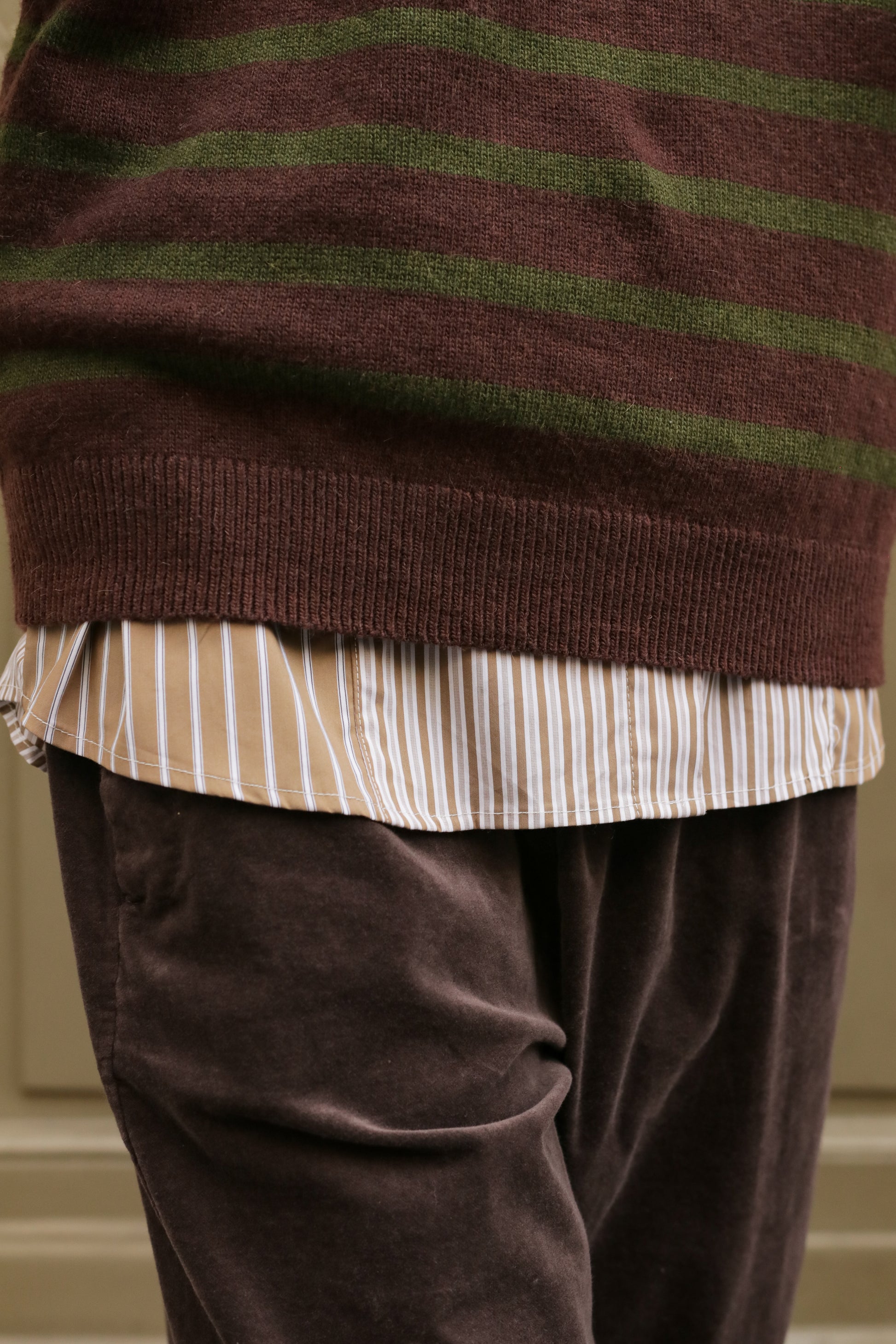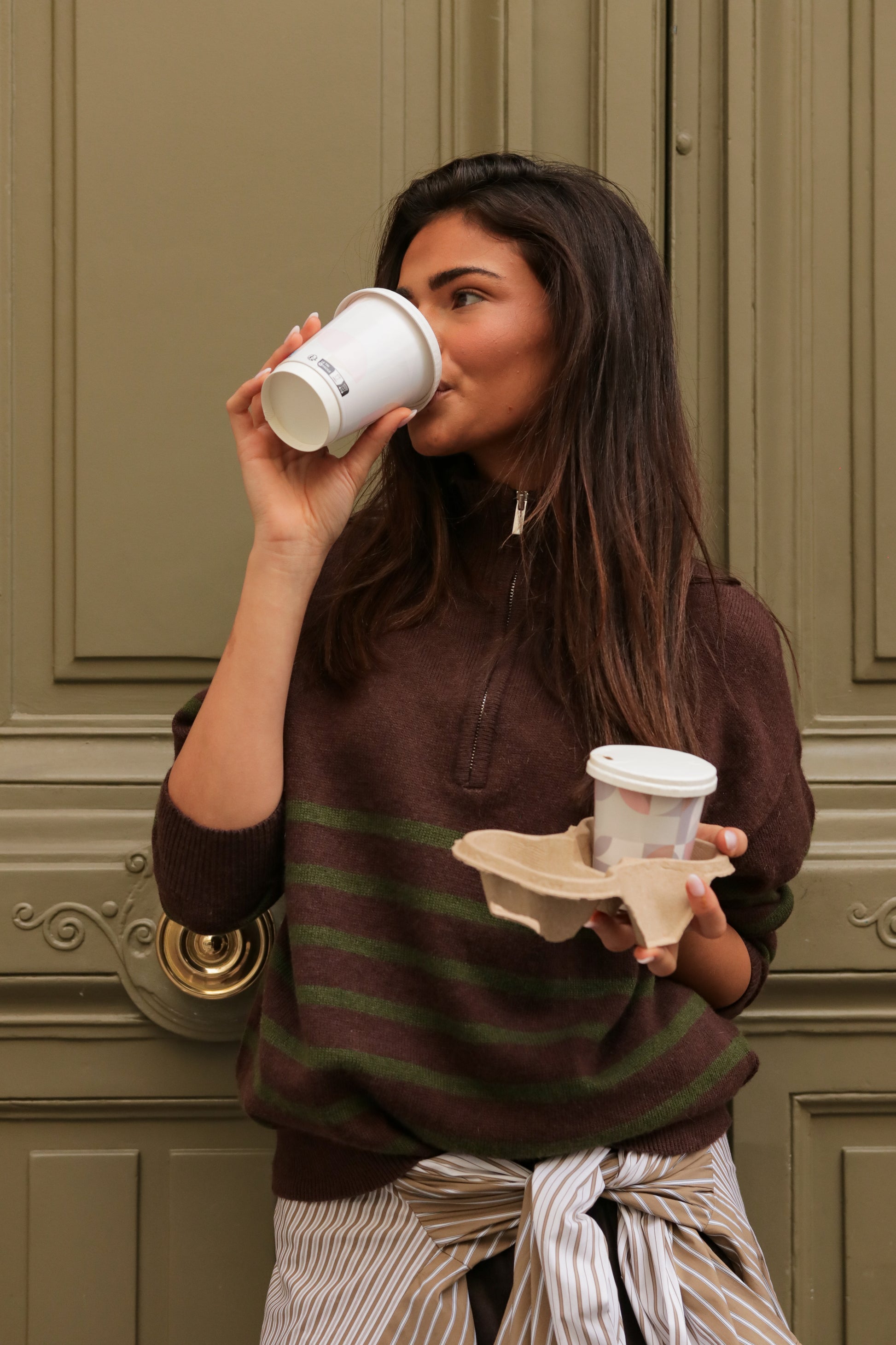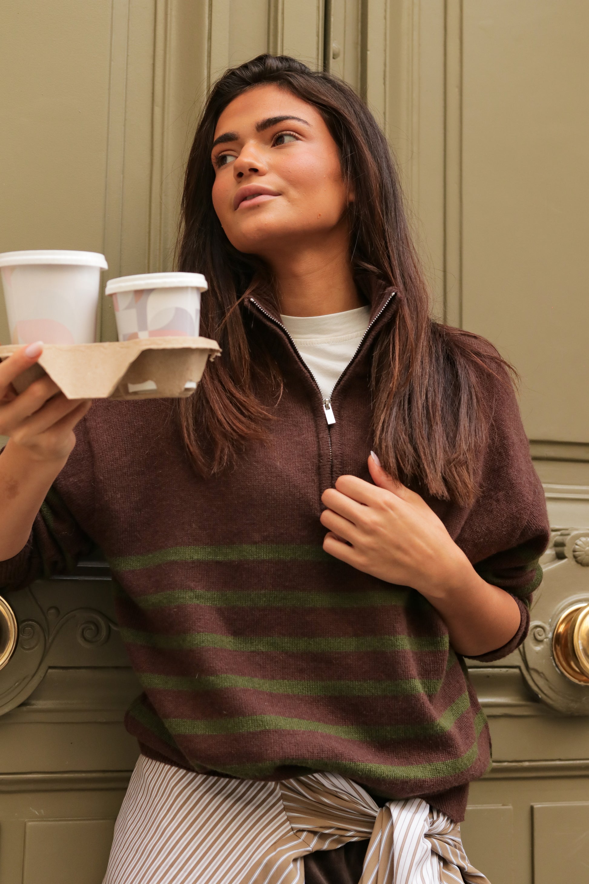 Les rayures vert kaki sur la base chocolat ajoutent une touche sportive chic, facile à associer avec un jean, un pantalon droit ou même une jupe midi.