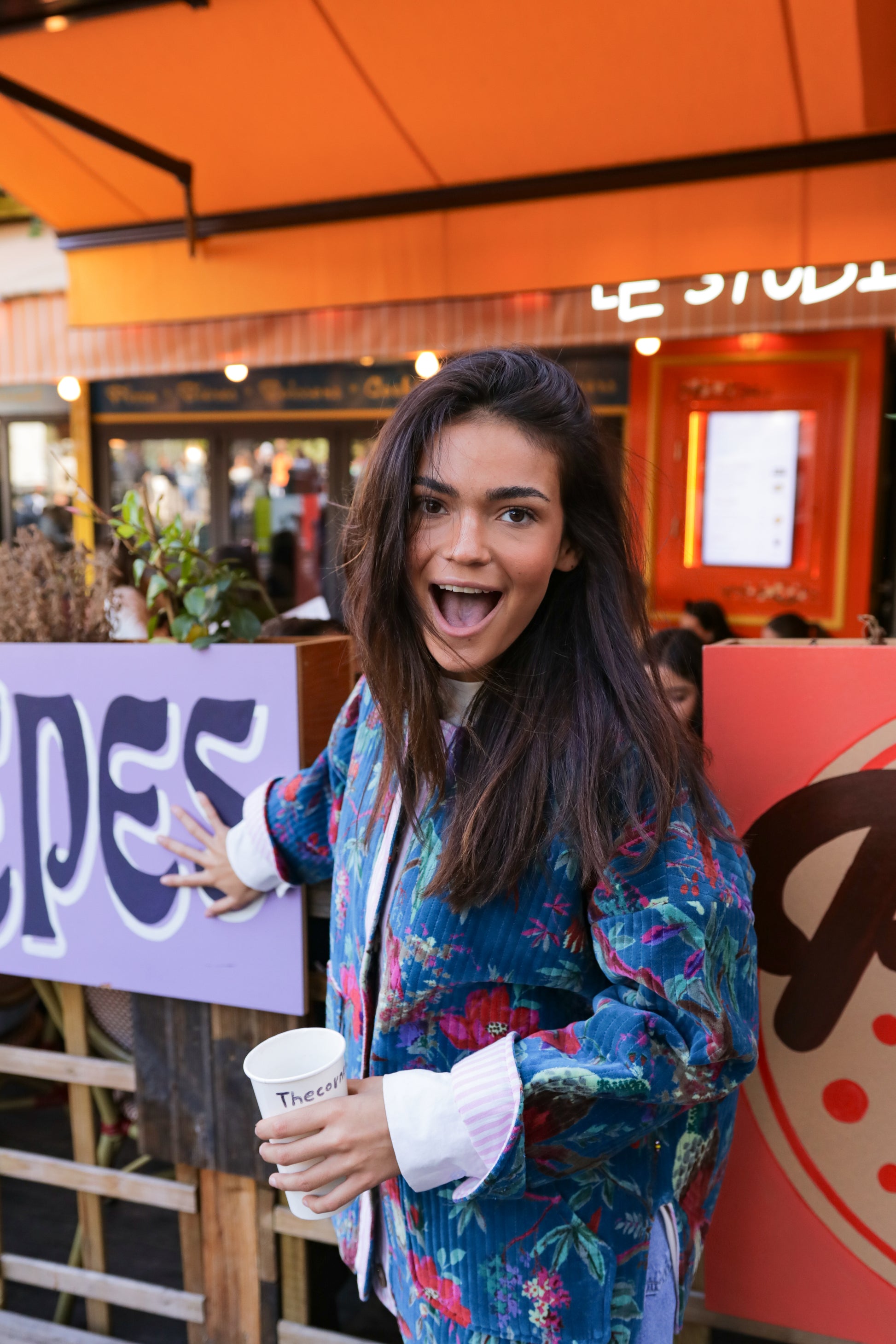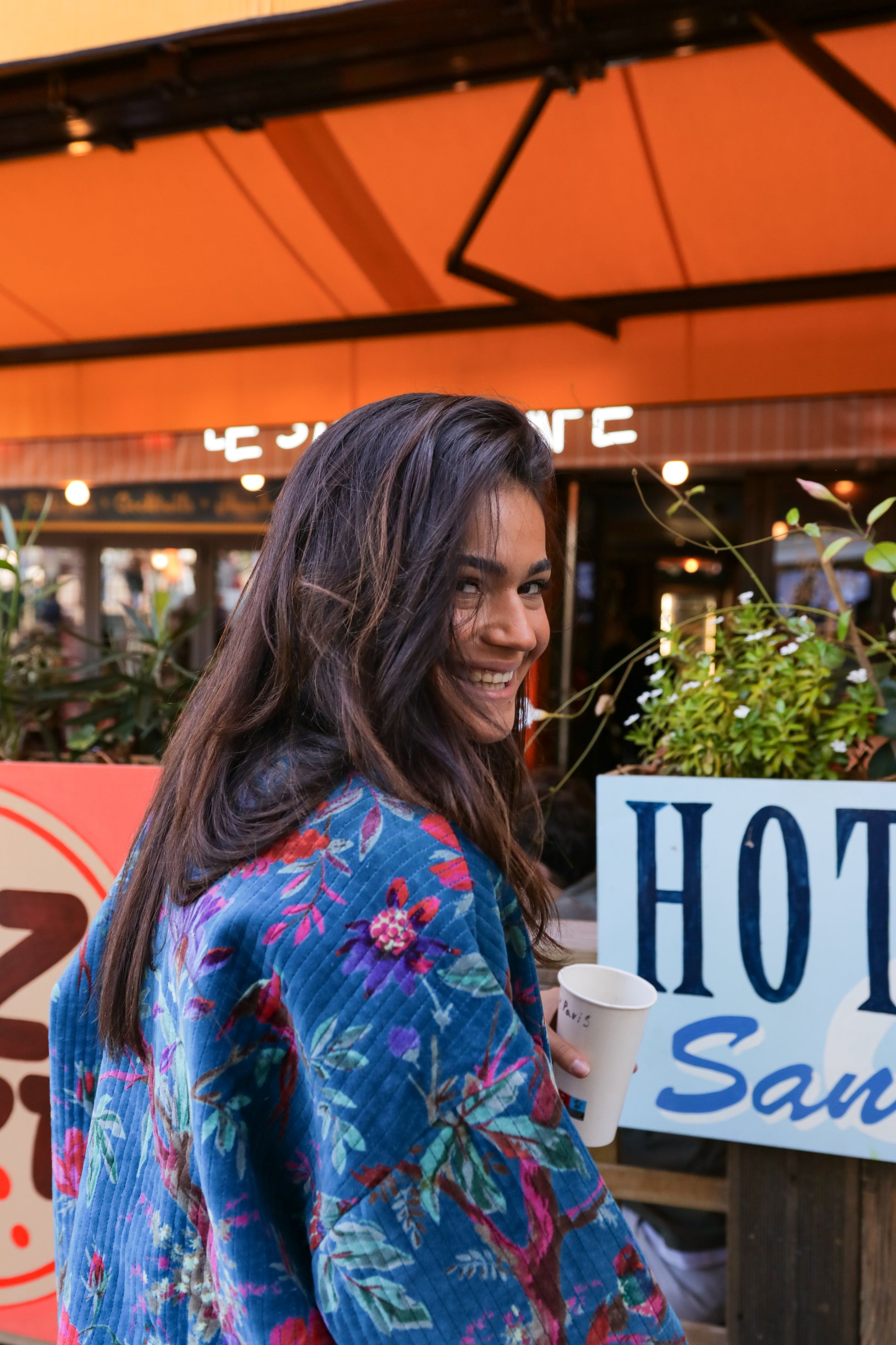 Confectionnée en velours de coton doux, cette veste arbore de délicates imprimées florales inspirées des jardins fleuris et des matins ensoleillés des cafés.