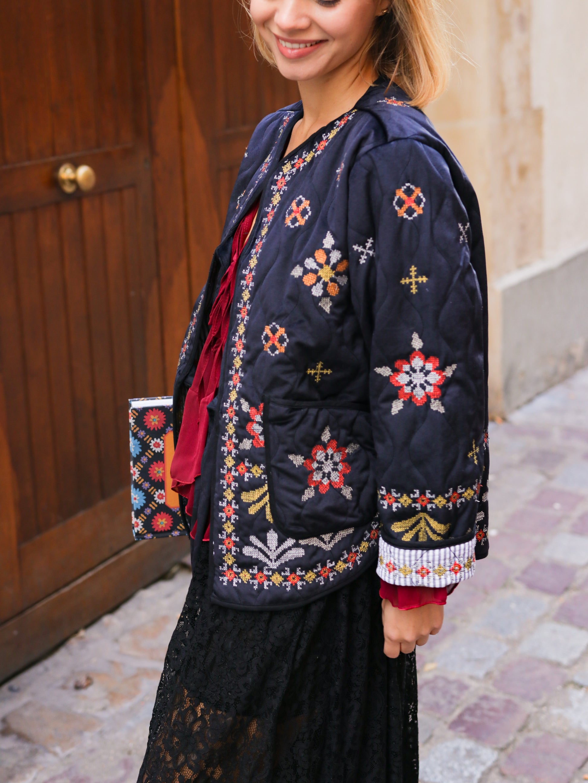Cette veste matelassée est ornée de broderies colorées et de détails perlés, créant un motif riche et texturé.