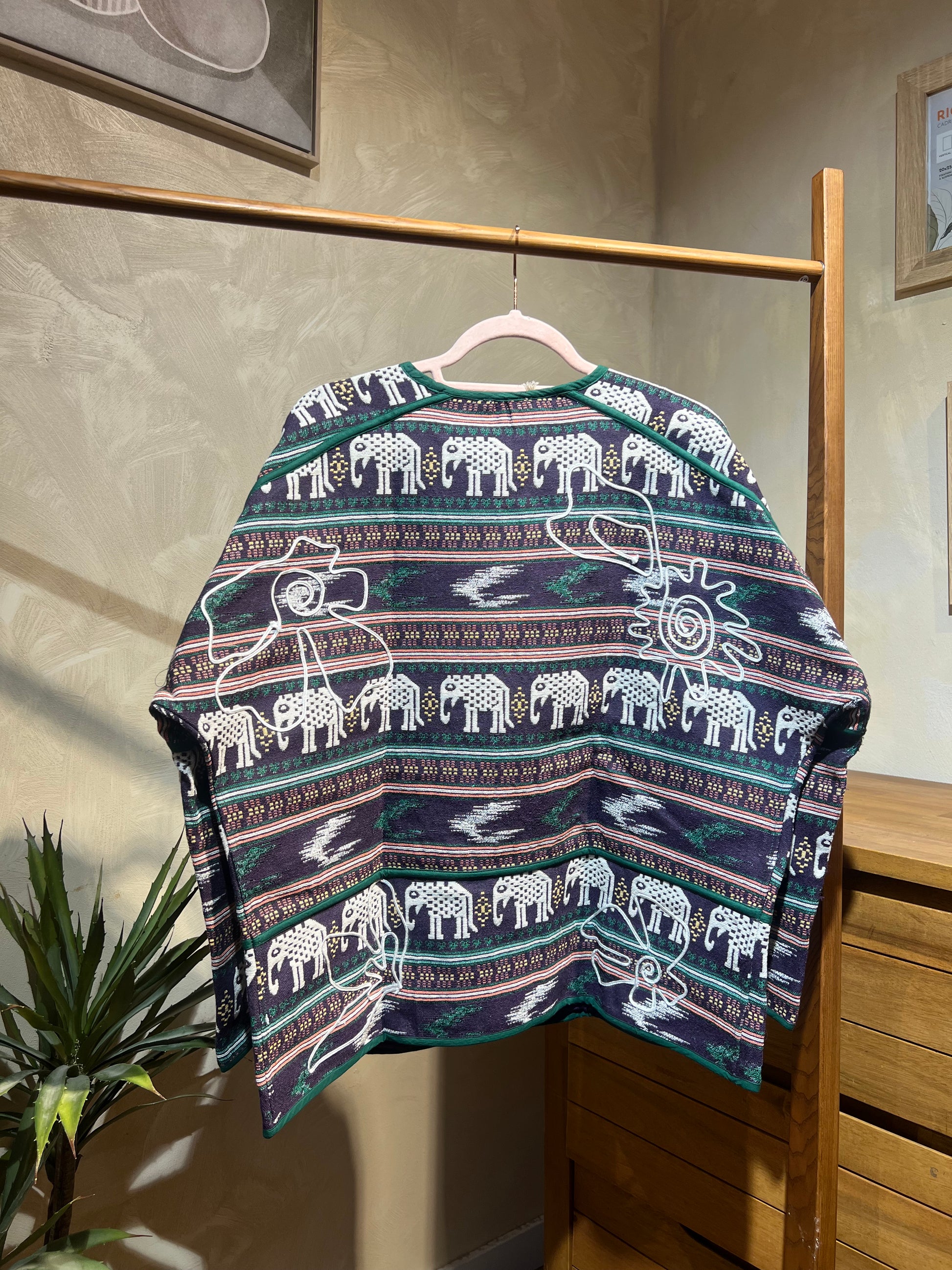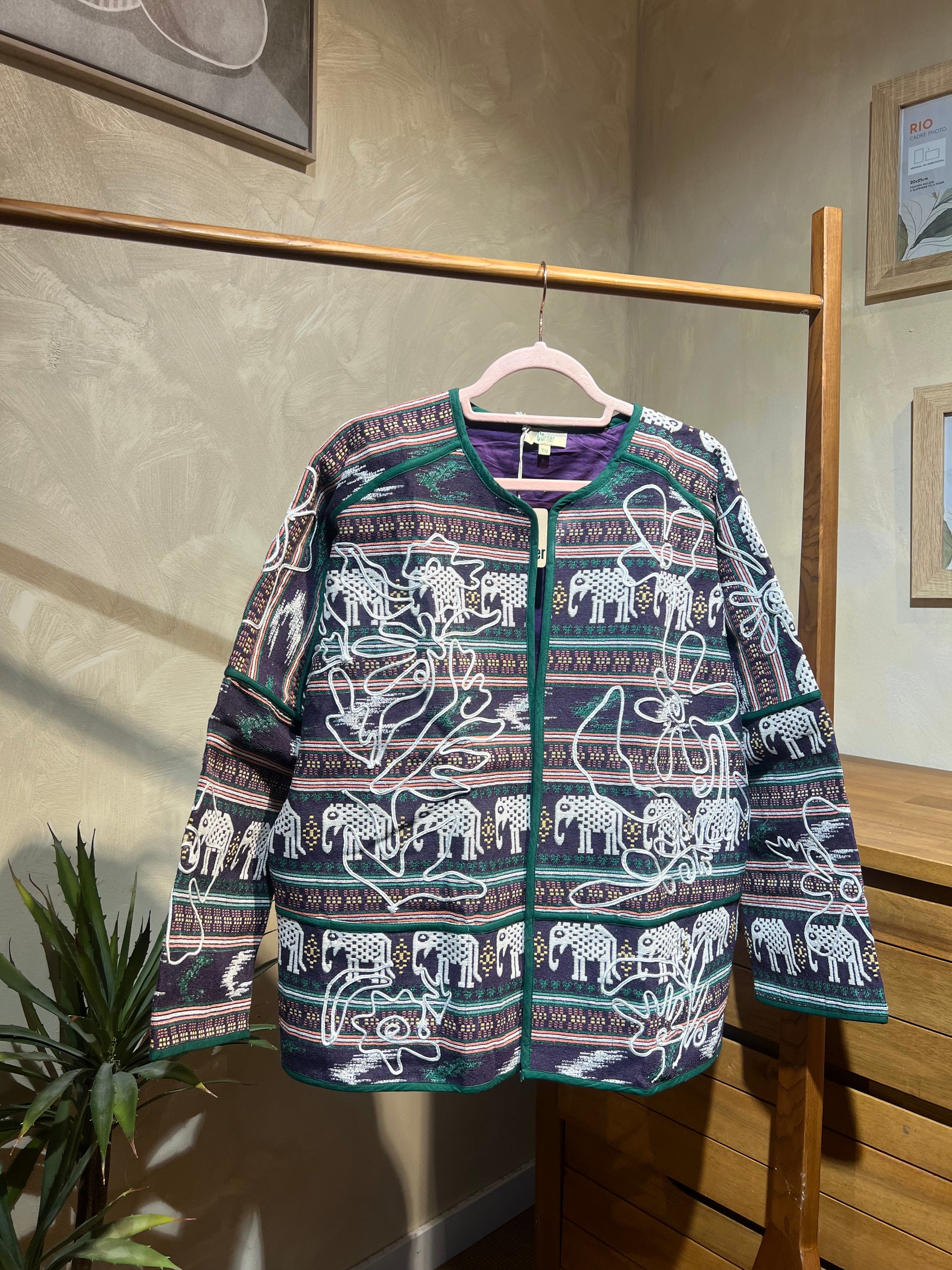 Veste en coton à motifs tissés multicolores, rehaussée de broderies contrastées.