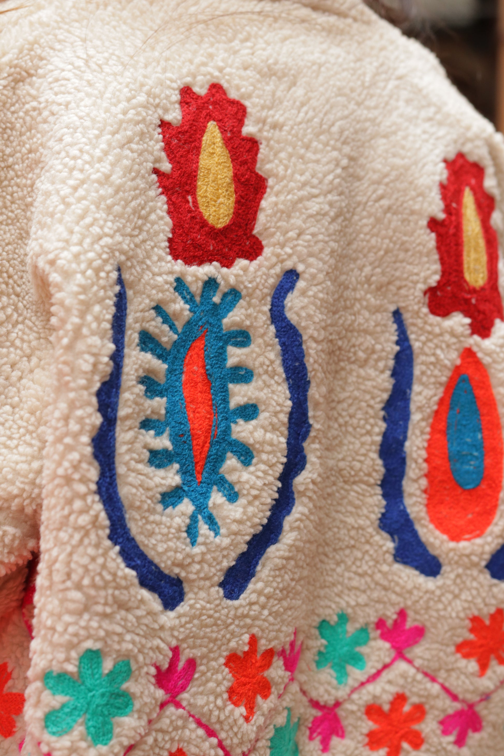 Sa matière effet sherpa, moelleuse et enveloppante, est sublimée par de grands motifs colorés inspirés des broderies folkloriques.