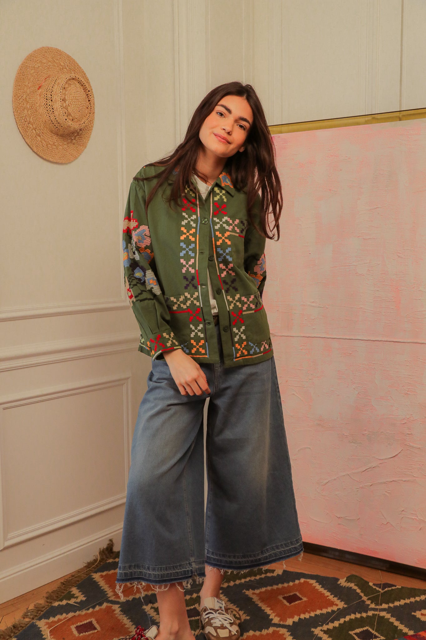 Veste en coton ornée de broderies florales géométriques multicolores.