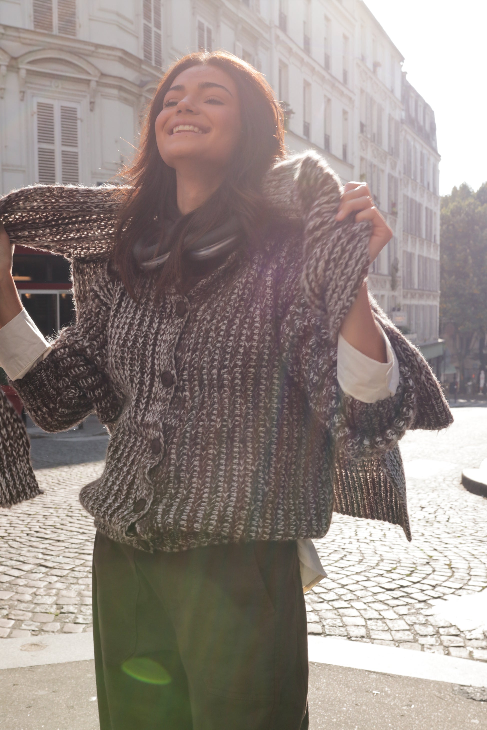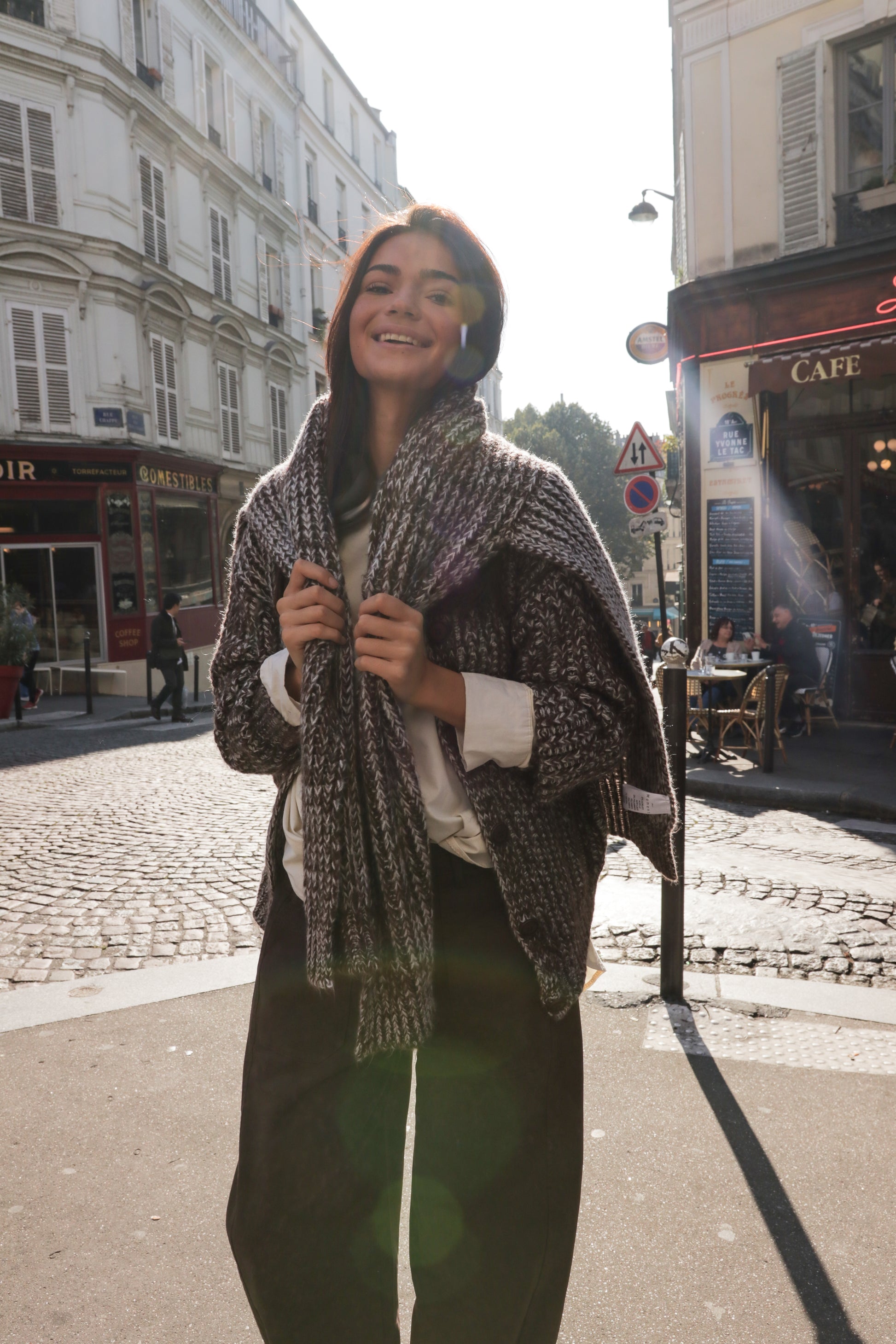 Ses tons chinés et ses mailles texturées en font le vêtement idéal à superposer : portez-le drapé sur les épaules.