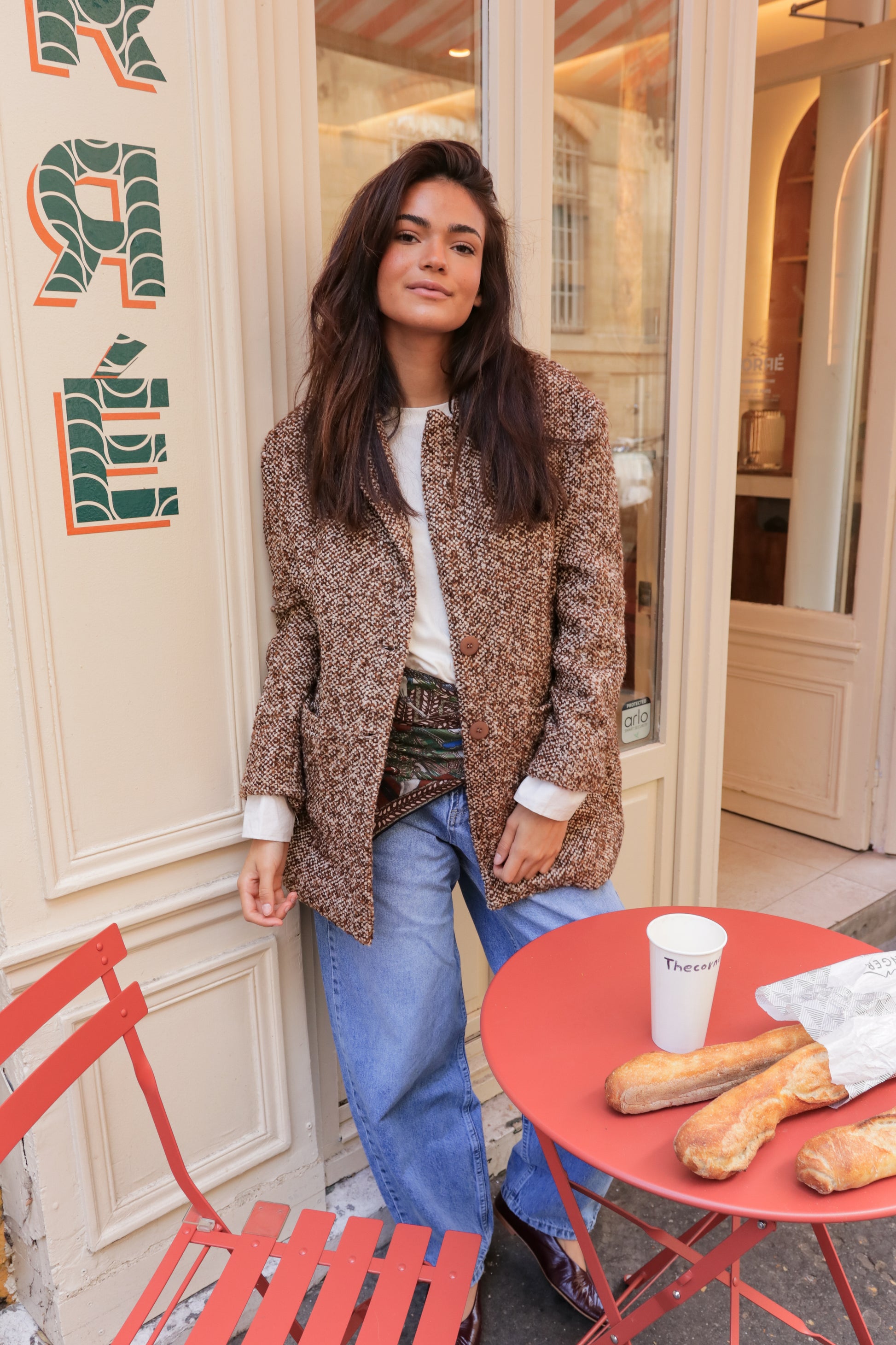 Ce manteau en tweed texturé évoque la douce chaleur d'un café parisien matinal.